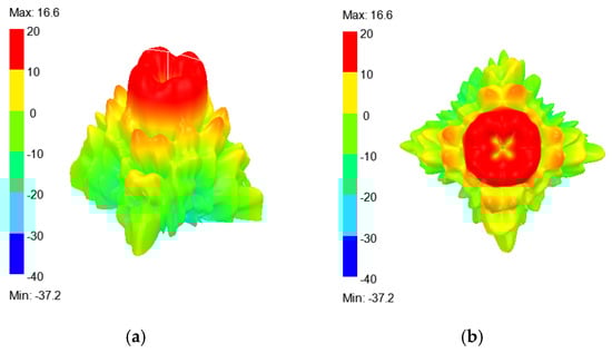The near-field calculation of a very large metasurface, such as a 60 × 60 array, necessitates an expanded radiation box as depicted in Figure 8 and Figure 10. However, when the metasurface size is increased to 60 × 60, the computational workload grows exponentially, surpassing the capabilities of a single workstation for completing the task. At 12 GHz, Figure 13 illustrates the far-field diagram for metasurfaces of varying sizes. It can be observed that the far field exhibits a hollow circular beam characteristic of vortex waves. In this context, circularly polarized waves are employed to excite metasurfaces measuring 20 × 20 and 40 × 40 to obtain the far-field patterns.