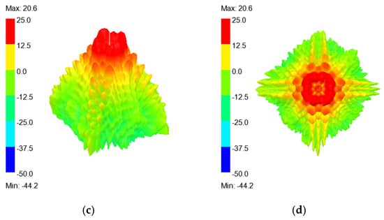 Far-field calculation of vortex waves generated by the l = −3 metasurface and l = −5 metasurface at 12 GHz. (a) Trimetric view and (b) top view of the l = −3 metasurface; (c) trimetric view and (d) top view of the l = −5 metasurface.