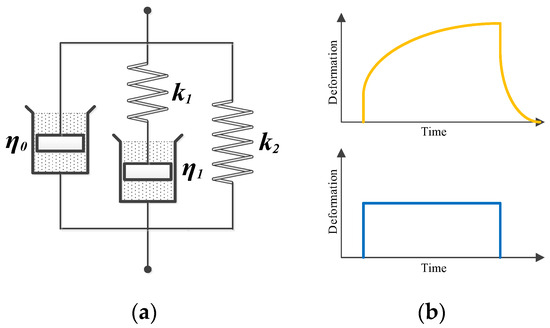 where is the stiffness coefficient of spring 1 in Figure 1a, is the stiffness coefficient of spring 2, and and correspond to the viscosity coefficients of viscous element 0 and viscous element 1, respectively. The equation describes a viscoelastic system involving a fluororubber mechanical structure that is subject to both elastic and viscous forces. The first derivative of strain indicates the rate of deformation, while the second derivative shows how the material’s deformation is accelerating or decelerating. The term involving stress reflects how changes in stress impact the system over time. The model includes both the shear viscosity coefficient and volumetric viscosity coefficient , and these are unified and represented as . According to Equation (1), this can be expressed as .