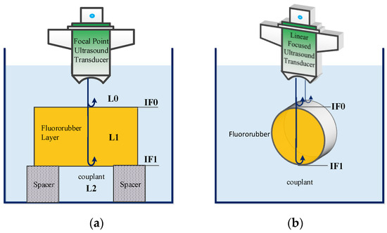 Ultrasonic layered propagation model in fluororubber experiment. (a) The model for fluororubber sheet specimen, and (b) the model for fluororubber column specimen. To ensure that the meas-urement area of the ring is straight, its axis must be aligned parallel to the axis of the linear focused transducer.