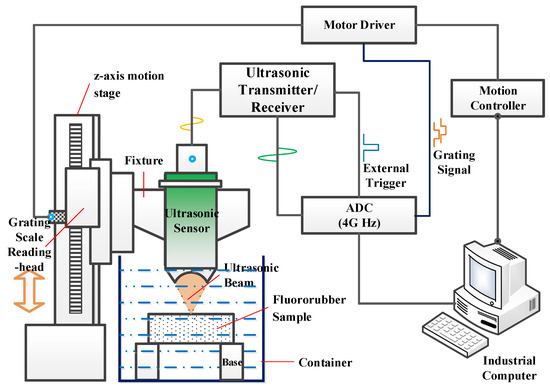 The structure of the ultrasonic evaluation system for the mechanical property degradation of fluororubber developed in this paper is shown in Figure 3. It consists of an ultrasonic sensor, an ultrasonic transmitter/receiver, a high-frequency signal analog-to-digital converter (ADC), a Z-axis motion platform and its controller as well as an industrial computer.