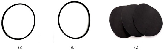 Fluororubber specimens for the ultrasonic measurement experiments. (a) The fluororubber sealing ring serviced for one year, (b) the brand new fluororubber sealing ring, and (c) fluororubber sealing gasket specimens purchased externally.
