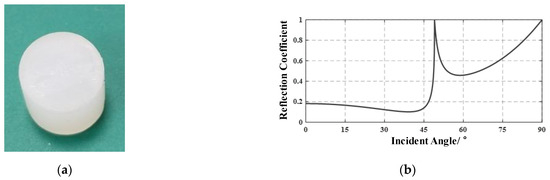 According to previous studies, when the relationship between the acoustic impedance of the reference specimen and the test specimen satisfies , the ultrasonic experimental system can achieve a good signal-to-noise ratio [8]. In this paper, epoxy resin (6040, Dow Corning Holding Company, Midland, MI, USA) was used to fabricate cylinders 6 mm in diameter and 5 mm in thickness with a density of 1090 kg/m. The longitudinal wave speed was 1960 m/s and the shear wave speed was 973 m/s. Figure 5a shows the physical image of the reference specimen, while Figure 5b presents the reflection coefficient values of the specimen at different angles in 20 °C water. From Figure 5, it can be observed that when the incident angle is within 10°, the acoustic reflection coefficient on the surface of the specimen approaches a fixed value, which meets the relevant requirements for measuring the two-dimensional reflection coefficient spectrum with a small-angle focused probe.
