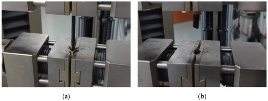 Mechanical tensile tests were carried out on a universal material testing machine (Roell Z020, Zwick, Ulm, BW, Germany) with a tensile speed of 50 mm/min. To enhance the friction and prevent the specimen from slipping during the stretching process, sandpapers were wrapped around the gripping positions at both ends of the fluororubber specimen, ensuring that the tensile limit could be accurately measured. The specimen was clamped at the lower end, and the upper fixture was adjusted to a position vertically above the lower fixture, 20 mm apart. After resetting the load to zero, the upper fixture was tightened and the tensile test began. As shown in Figure 6, the upper fixture moved upward, while the load and strain data were recorded in real-time until the specimen broke.