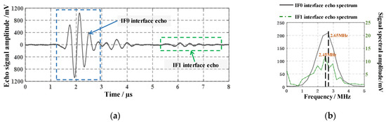 Ultrasonic echo signals and their spectra conducted using a 2.5 MHz line-focus ultrasonic transducer. (a) Ultrasonic echo signals including the echo signals from IF0 and IF1. (b) The spectrum of echo signals from IF0 and IF1. The main frequency of the echo signal shifted from 2.65 MHz (IF0 interface echo) to 2.45 MHz (IF1 interface echo).