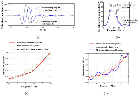 Ultrasonic echo signals and reflection coefficient curve. (a) The ultrasonic echo signal amplitude from IF0 of the used sealing ring was higher than that of unused sealing ring. (b) In the spectrum of echo signals at the upper and lower interfaces, a noticeable echo aliasing phenomenon could be seen in the ultrasonic echo signal of the used sealing ring. (c) Model fitting curves and measured curve of the used sealing rings at the normal incidence angle. The values of the three curves were close, and their trends were similar. (d) Model fitting curves and the measured curve of the unused sealing rings at the normal incidence angle. The measured curve showed both increasing and decreasing fluctuations, but the overall trend followed that of the fitting curves, exhibiting a general increasing trend.