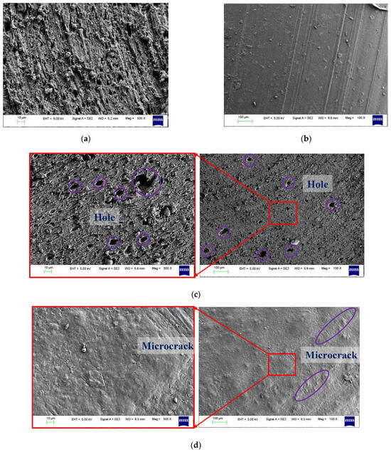 The SEM images of the fluororubber specimens. (a) Cross-section of the used sealing ring, (b) cross-section of the unused sealing ring, (c) large number of holes in the cross-section of the used sealing ring, and (d) microcracks on the aged surface of the used sealing ring. Purple circles in panels (c) and (d) indicated holes and microcracks, respectively.