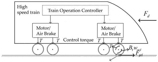 where represents the displacement, is the train’s mass, and denotes the basic resistance force acting on the train. The term corresponds to the adhesive force for the ith wheel. The variables and represent the angular velocity and linear velocity of the ith wheel, respectively. The torque applied by the motor or air brake on the ith wheel is denoted by . for the motor or air brake applied to the ith wheel moment. In Equation (2), the summation is performed over 32 axles, reflecting the total number of axles on the train. Furthermore, the parameter represents the wheel radius, while denotes the damping coefficient for the ith wheel.