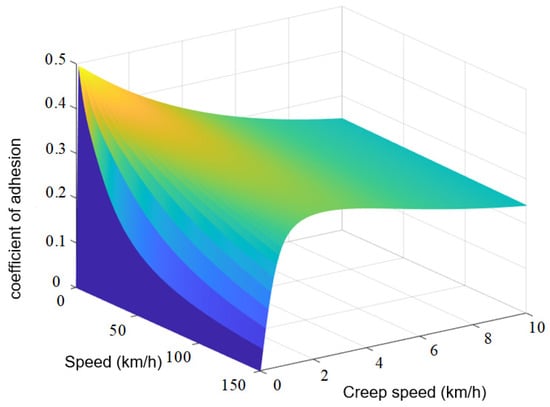 As shown in Figure 2, as the braking force applied to the wheel circumference increases, the wheels experience increasing adhesion. When the creep speed approaches the peak adhesion characteristics, the driving force applied to the wheel brings the wheel closer to the rail surface, maximizing adhesion. However, if the driving force continues to increase beyond this point, the wheel–rail adhesion decreases rapidly, leading to wheel slip, which compromises the train’s safety.