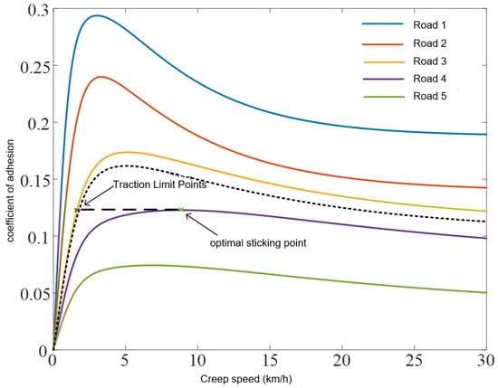 For a specific train route, the wheel–rail adhesion state can be categorized into five typical conditions, ranging from good to poor. The adhesion characteristics between the wheel and rail under these varying conditions at a fixed speed are illustrated in Figure 3.