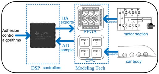 To closely integrate the adhesion control algorithm with practical applications, the algorithm is implemented on the DSP controller, and the train model is downloaded to the ModelingTech semi-physical simulation platform using STAR-SIM software, whose version number is 4.6.2.9. This setup creates a DSP-ModelingTech Hardware-in-the-Loop experimental platform to validate the effectiveness of the proposed algorithm. It is important to note that the output from the semi-physical platform, ModelingTech, contains a certain level of noise. For a visual representation of the experimental process, please refer to Figure 5.