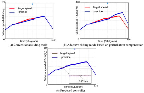 In contrast, Figure 7c and Figure 8c demonstrate that the higher-order sliding mode-based active anti-slip control designed in this study achieves the smallest tracking errors in both speed and displacement. This effectiveness is attributed to the controller’s strategy of selecting a typical road condition with slightly worse adhesion than the current conditions. By utilizing the active anti-slip strategy, the controller calculates the maximum traction force available and employs Newton’s iterative method to appropriately limit the controller’s output. Consequently, the wheel–rail system consistently operates within the adhesion state, avoiding wheelset slip and preventing significant traction loss.