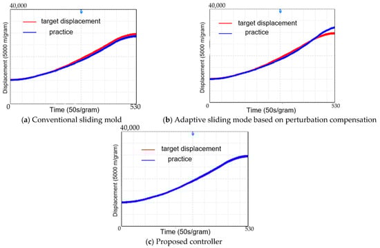 After 320 s, when the train transitions into wet road conditions, the braking force exerted by the motor on the wheels becomes smaller than the adhesion force, thereby restoring adhesion between the wheels and rails. As a result, the conventional sliding mode control reduces the tracking errors in both speed and displacement. However, the adaptive sliding mode control based on perturbation compensation fails to maintain accurate tracking of the target curve once adhesion is restored, due to the cumulative error of its internal integral term, which ultimately leads to controller failure.