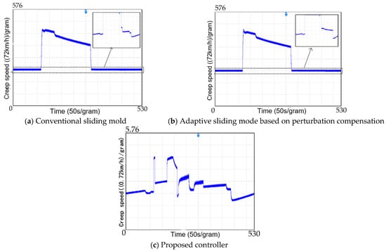 Figure 9 presents the creep-slip velocity graphs during the process of controlling the train to track the target velocity–displacement curve using different controllers. As shown in plots (a) and (b) of Figure 9, under conventional sliding mode control and adaptive sliding mode control based on perturbation compensation, the lack of an anti-slip strategy results in the creep speed exceeding 200 km/h after the train enters icy road conditions at 115 s, leading to noticeable wheelset slip.