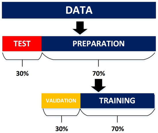 Furthermore, for the subsequent processes (training, validation, and testing), the Clean Matrix is divided as follows: 70% for the preparation of the classifiers and 30% for evaluating them. Additionally, the training matrix is further subdivided into 70 for training and 30% for the validation of the models, as shown in