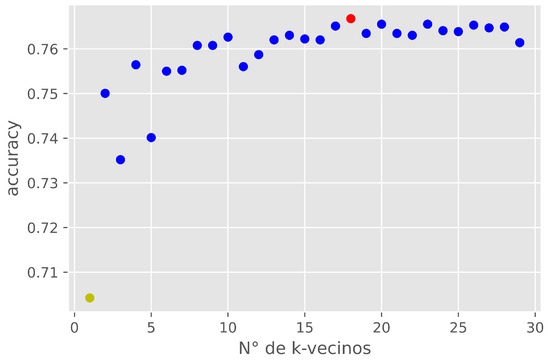 Figure 10, the results are shown; it can be seen that with K = 18 (red color), the highest effect was achieved with an accuracy of 0.766, and the lowest value was with K = 1 (yellow color) with an accuracy of 0.69.