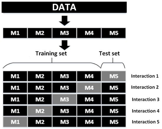 The performance of the classifiers is calculated by using the cross-validation technique, which involves dividing the dataset into i samples. In each iteration, one sample is used as the test set and the remaining samples as the training set. For each iteration, the test set is changed, and this process is repeated until all samples have been a test set (see
