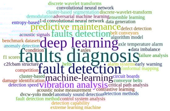 To support this descriptive analysis, a bibliometric analysis was conducted on the 16 manuscripts included in this Special Issue. Figure 1 shows a cloud graph of the words included in the keywords of these works. Firstly, this figure outlines the orientation of all works with the Special Issue topic, being the words machine learning and those words related to fault diagnosis (predictive maintenance, faults diagnosis, and detection) the most relevant. Secondly, it includes words related to the most promising machine learning techniques for these purposes, such as deep learning, convolutional neural networks, or adversarial learning. Thirdly, it includes words about the main signals to be taken into consideration in this field, such as temperature, vibration, or acoustic. Fourthly, it includes words that highlight the main challenges of machine learning in this field of application, such as data imbalance, benchmark datasets, or cluster detection. Finally, it includes words related to the final application of these techniques to this research field, such as belt conveyors, circuit boards, or failure analysis. In summary, Figure 1 shows the convergence of published keywords in the works included in the Special Issue, by means of using different machine learning techniques and sensors’ signals in different industrial problems but facing the same challenges and finding generalizable solutions.