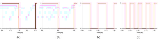 Figure 2. Frequency patterns for haptic and visual feedback. 1 represents 100% intensity vibration or light on, while 0 indicates no vibration or light off. (a) 0.5 Hz, (b) 1.0 Hz, (c) 2.0 Hz, and (d) 4.0 Hz. - Feedback size (three levels): small, medium, and large, as shown in Figure 3.