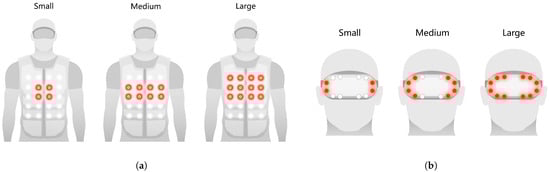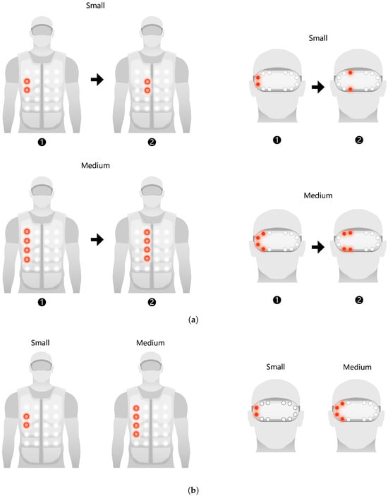 Haptic feedback serves as an important alternative mode for visually impaired individuals to perceive external information [24,47]. Research on vibration-based feedback [42,43,44] has demonstrated varying tactile sensitivity across different body regions [80]. While studies have explored haptic feedback on various body locations, including the waist [81], arm [82], and leg [83], the chest and abdomen regions have shown particularly promising results. Kim et al. discovered that these regions exhibit exceptional tactile recognition capabilities, with accuracy rates reaching 95% [84]. Park et al. further demonstrated that, by controlling the vibration frequency and contact area parameters, chest and abdomen-based feedback can effectively convey different levels of urgency perception [85]. Studies have also revealed that approximately 90% of legally blind individuals retain basic light perception abilities [2,3], allowing them to detect changes in light characteristics [27,28]. Yang C et al. confirmed that head-mounted LED arrays could effectively convey information through controlled light patterns [27].