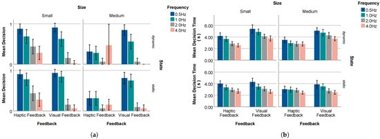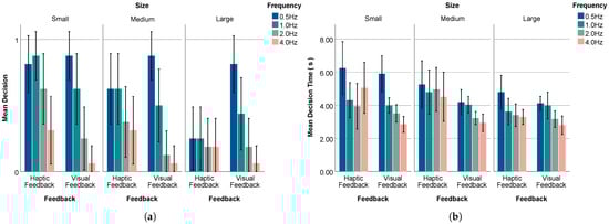 We recorded participants’ crossing decision under different feedback modes and parameter-combination conditions; “1” represented the decision to cross, and “0” represented the decision to wait. The main effects were found for frequency () and size (). Additionally, we observed significant interaction effects between feedback and frequency () and between feedback and size (). The mean cross rate across feedback modality, frequency, and Size is illustrated in Figure 4a. Post hoc Bonferroni pairwise comparisons showed that the cross rate of frequency 0.5 Hz (0.72) was significantly more than frequency 2.0 Hz (0.27) and frequency 4.0 Hz (0.13) ; frequency 1.0 Hz (0.55) was significantly more than frequency 2.0 Hz (0.27) and frequency 4.0 Hz (0.13) . The cross rate of the small size (0.54) was significantly more than that of the large size (0.26) ; the medium size (0.40) was significantly more than the large size (0.26) .