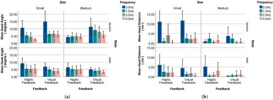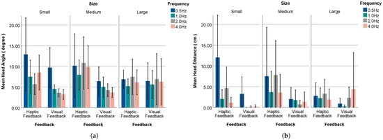 We also recorded the head movement distance along X, Y, and Z dimensions. For the X dimension, the main effects were found for feedback (). Post hoc Bonferroni pairwise comparisons showed that the distance of haptic feedback (4.66 cm) was significantly longer than that of visual feedback (2.99 cm) . For the Y dimension, the main effects were found for feedback () and frequency (, ). Post hoc Bonferroni pairwise comparisons showed that the distance of haptic feedback (2.30 cm) was significantly longer than that of visual feedback (1.18 cm) . The distance of frequency 0.5 Hz (2.34 cm) was significantly longer than that of frequency 1.0 Hz (1.53 cm) and frequency 4.0 Hz (1.32 cm) . For the Z dimension, the main effects were found for feedback (). Post hoc Bonferroni pairwise comparisons showed that the distance of haptic feedback (4.40 cm) was significantly longer than that of visual feedback (3.13 cm) .