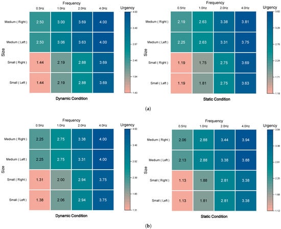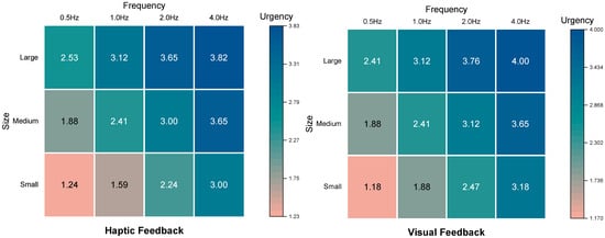 After the test, the participants completed a questionnaire measuring both urgency and confidence. GEEs revealed significant effects of frequency () and size () on urgency (Figure 6). Post hoc Bonferroni pairwise comparisons showed that the urgency of frequency 4.0 Hz (3.61) was significantly more than that of frequency 2.0 Hz (3.04) , frequency 1.0 Hz (2.41) , and frequency 0.5 Hz (1.84) ; that of frequency 2.0 Hz (3.07) was significantly more than that of frequency 1.0 Hz (2.41) and frequency 0.5 Hz (1.84) , and that of frequency 1.0 Hz (2.41) was significantly more than that of frequency 0.5 Hz (1.84) . The urgency of the large size (3.34) was significantly more than that of the medium size (2.77) and the small size (2.07) ; that of the medium size (2.77) was significantly more than that of the size small (2.07) .