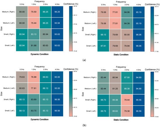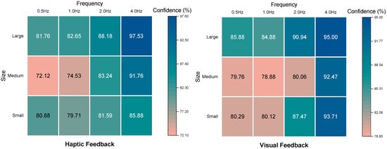 For confidence ratings, GEEs revealed significant effects of frequency (, ) and size () on confidence (Figure 7). Post hoc Bonferroni pairwise comparisons showed that the confidence of frequency 4.0 Hz (92.87%) was significantly more than that of frequency 2.0 Hz (85.73%) , frequency 1.0 Hz (79.77%) , and frequency 0.5 Hz (79.64%) ; that of frequency 2.0 Hz (85.73%) was significantly more than that of frequency 1.0 Hz (79.77%) . The confidence of the large size (87.77%) was significantly more than that of the medium size (81.43%) .
