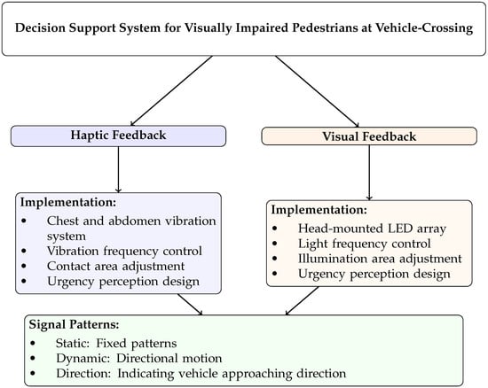 With advancements in the Internet of Things (IoT) and vehicle-to-everything (V2X) technologies, smart infrastructure can now collect and communicate real-time traffic information, such as traffic light status and approaching vehicles. Wearable and handheld assistive devices for visually impaired pedestrians can leverage these data to provide timely feedback that enhances their awareness of crossing conditions. Existing assistive technologies, such as smartphone navigation [9,10,11,12], smart canes [13,14,15], and intelligent guide robots [16,17,18] have made significant progress in daily navigation. These technologies, developed through both laboratory research and field studies, have demonstrated considerable success in general mobility assistance and route guidance. However, these technologies still face challenges in conveying information effectively in street-crossing scenarios, particularly in communicating critical information such as the remaining time for pedestrian traffic lights [5,19,20] and safe crossing gaps [21]. Traditional auditory feedback faces notable limitations in street environments: environmental noise can mask critical auditory cues [22], and it may lead to auditory channel overload, impairing the ability of visually impaired individuals to perceive surrounding environmental sounds [23].