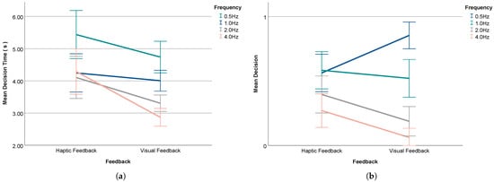 We recorded participants’ decision time under different feedback modes and parameter combination conditions, defined as the time interval from receiving the feedback signal to making the final crossing decision. The main effects were found for feedback (), frequency (), and size (). Additionally, we observed significant interaction effects between feedback and frequency () and between feedback and size (). The mean decision time across feedback modality, frequency, and size is illustrated in Figure 4b. Post hoc Bonferroni pairwise comparisons showed that the decision time of the haptic feedback (4.46 s) was significantly longer than that of the visual feedback (3.66 s) . The decision time of frequency 4.0 Hz (3.49 s) was significantly faster than that of frequency 0.5 Hz (5.05 s) and frequency 1.0 Hz (4.11 s) ; frequency 2.0 Hz (3.67 s) was significantly faster than frequency 0.5 Hz (5.05 s) and frequency 1.0 Hz (4.11 s) ; frequency 1.0 Hz (4.11 s) was significantly faster than frequency 0.5 Hz (5.05 s) . The decision time of the large size (3.61 s) was significantly faster than that of the small size (4.36 s) and the medium size (4.18 s) .