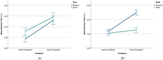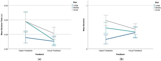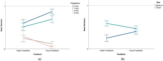We recorded the total head movement distance during the decision time. The main effect was found for feedback (), frequency (), and size (). Additionally, we observed significant interaction effects between feedback and size (). The mean total head movement distance across feedback modalities, frequency, and size is illustrated in Figure 5b. Post hoc Bonferroni pairwise comparisons showed that the total head-movement distance of the haptic feedback (3.81 cm) was significantly longer than that of the visual feedback (1.23 cm) .