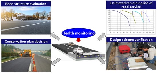 In recent years, the mechanical parameter of pavement structures is mainly evaluated by the bending of a Falling Weight Deflectometer (FWD). A large amount of research has been carried out on the modulus inversion and modulus analysis of pavement structures based on the results of FWDs at home and abroad in order to scientifically evaluate the mechanical state of layered pavement structures. Nevertheless, the reliability of modulus inversion results has always been a core concern in the industry [5]. For obtaining the accurate mechanical state of pavement structures, mechanical detection technology for the surface of pavement structures has been developed successively, which has made important contributions to the scientific evaluation of pavement structures [6,7,8]. As an external detection method, technology for detecting pavement surfaces is not only time-consuming but also cannot involve full-time detection for the internal layered structure states. In many cases, damage of a pavement is often detected after the road disease has occurred by the current detection technology, which is generally an after-the-fact detection method.