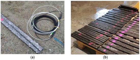 However, it must be noted that due to the fragility of fiber grating sensors and the complexity of road construction environments and service conditions, fiber grating sensors are difficult to be directly used for field monitoring and are extremely easily damaged under load conditions. In order to improve their survival rate, it is necessary to carry out encapsulation research and research on installation protection methods. In 2018, for the first time in Flanders, Kara et al. [25] conducted a pre-construction monitoring study on the bottom of asphalt pavements with different layers (surface and base). By embedding the fiber grating and installing it in the prefabricated base and asphalt layer groove, a cross-sectional strain measurement was obtained, as shown in Figure 2.