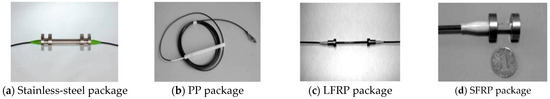 With the gradual maturity and stability of optical fiber communication technology and optical fiber sensing technology, research has gradually shifted from the development of new optical fiber demodulation principles and structures to the practical packaging of existing optical fiber sensors to meet different monitoring needs, as shown in Figure 3. Grakovski et al. [26] used a fiber-optic sensor that responds to deformation, and then, this information is further used for the estimation of the vehicle wheel’s speed, contact width, and length and the axle’s weight while in motion. Recorded signals from a truck passing over a group of fiber-optic sensors with various speeds and known weights are used as input data. Dong et al. [27] and Tan et al. [28] combined strain measurements and finite element simulations. A dynamic modulus test was therefore used to first obtain the viscoelastic characteristics of asphalt mixtures. The similarity theory with embedded fiber Bragg grating (FBG) sensors was used to develop a small-scale laboratory loading test. Studies were then carried out for measured strain validations in conjunction with a finite element method model. They also employed a fiber grating strain gauge that was based on polypropylene (PP) and fiber reinforced plastic (FRP) materials, and they embedded the calibrated fiber grating strain gauge in the asphalt concrete trabecular with conducted strain testing in static and dynamic loading modes. However, the FRP package sensor was separated from the matrix, and the range of the tests needs to be expanded to further verify the effectiveness of the measured strain of the fiber grating sensor [29,30]. At the same time, by using the detection data of optical fiber grating strain gauges combined with the Burgers viscoelastic model, the permanent deformation of asphalt pavements can be calculated [31,32,33].