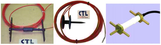 In road engineering, the ASG (asphalt strain gauge) asphalt pavement resistance strain gauge developed by CTL (Hico, TX, USA) and the TML (Tokyo, Japan) asphalt strain gauge are relatively mature, with many engineering applications, as shown in Figure 6. According to the monitoring direction, the ASG asphalt strain gauge is divided into a horizontal asphalt strain gauge (I-shape) and a vertical asphalt strain gauge. The strain gauge involves sticking the resistance strain gauge on a threaded nylon rod member. Both ends of the nylon rod are connected to an aluminum rod to measure the axial strain. In the monitoring element area, polysulfur polymer and silicon butyl rubber materials are used to package and protect the strain sheet to adapt to the construction conditions and working environments of asphalt pavements. By collecting the output voltage of the sensor, the corresponding strain can be converted, as shown in Equation (2). The embedded asphalt strain gauge KM-100HAS of TML (Tokyo, Japan) also adopts an I-shaped structure with an aluminum rod at each end, which is used to fix the intermediate axial shaft. In order to make coordinate deformation of the strain gauge and the asphalt mixture, the middle axial rod of the strain gauge is selected, and the asphalt mixture modulus is equivalent to the material, with high temperature, moisture, and other properties of the material.