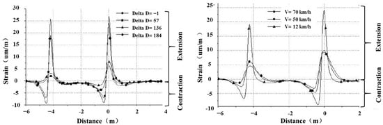 Due to the relatively stable performance of the above asphalt strain gauges and their high detection accuracy, they have been widely used in the study of the structural mechanics of asphalt concrete pavements or airport runways at home and abroad [45,46,47]. In 1998, as a pioneer case in the field of road monitoring, Al-Qadi et al. [48] buried pressure boxes, asphalt strain gauges, thermocouples, humidity probes, and vibrating wire strain gauges in a road of 3.2 km in Virginia, USA. They simulated the impact of different loads and driving speeds on the dynamic response of the road by passing through the sensor burial area with different numbers of passengers and speeds on trucks with known axle loads. In France, in the A41N highway [46], 47 strain sensors, 12 temperature sensors, and 2 fiber sensors were buried in the wearing layer, base course, and sub-base course. Trucks with known axle weights were driven at three different travel speeds and three different trajectories, and the signals were collected at 600 Hz to study the effect of two variables on the structural strain of the road, as shown in Figure 7. Cook et al.’s [49] study of debonding slips at the top of the HMA surface and the bottom of the HMA overlay of a runway using ASG strain gauges at Newark International Airport. Correia et al. [50] studied the mechanical properties of flexible asphalt pavements reinforced by geogrids using ASG strain gauges. Duong et al. [51] buried of TML strain gauges (Tokyo, Japan) in the asphalt layer to monitor the transverse and longitudinal strains, respectively, under different loading conditions. The corresponding mechanical responses were analyzed with the classical multi-layer linear elastic pavement model and the viscoelastic pavement model, respectively, and a comparison concluded that the viscoelastic model had better predictions.