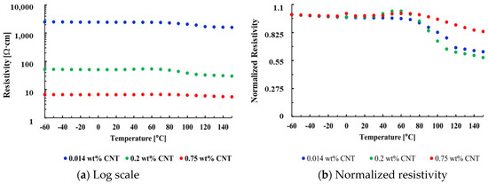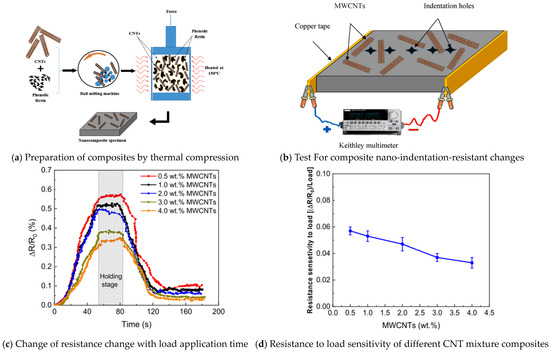 Earp et al. [121] investigated the electrical behavior of CNT epoxy composites in different temperature environments using a convection oven thermal vacuum chamber by determining the apparent resistance values and by normalizing the resistance values, which showed that CNT epoxy composites showed a small change in resistance values in the range of −60 °C to 60 °C, but beyond 60 °C, the resistance values showed a significant decreasing trend. Upon reaching 150 °C, the resistance value decreased to 40%, as shown in Figure 14. Factors that have been verified in the relevant literature to cause changes in electrical resistance include, among others, the temperature dependence of composite matrix materials, differences in the thermal expansion of matrix constituents, the thermal activation/thermal fluctuation-induced tunneling of carriers at elevated temperatures [122], and interactions with the atmosphere [123,124]. Al-Bahrani et al. [125,126] prepared self-sensing nanoresin composites based on CNTs by the hot-pressing method (as shown in Figure 15a) and found that overdiffusion of electrical rates occurs up to 1.0 wt% CNT doping, and material conductivity reaches a maximum when the doping level is 4.0 wt%. Meanwhile, resistance changes in the composite material when compressed in the micro-zone was tested using nano-indentation experiments (shown in Figure 15b) to verify the piezoelectric sensing properties of the material (shown in Figure 15c), the law of the resistance with micro-zone indentation damage was established, and a simple micro-scale model for predicting changes in the rate of change of the electrical resistance caused by the micro-indentation damage was proposed.