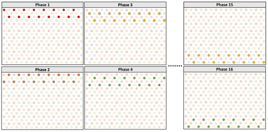 Biphasic stimulation pattern of electrodes. Each color on the bar represents electrodes stimulated with respect to time.
