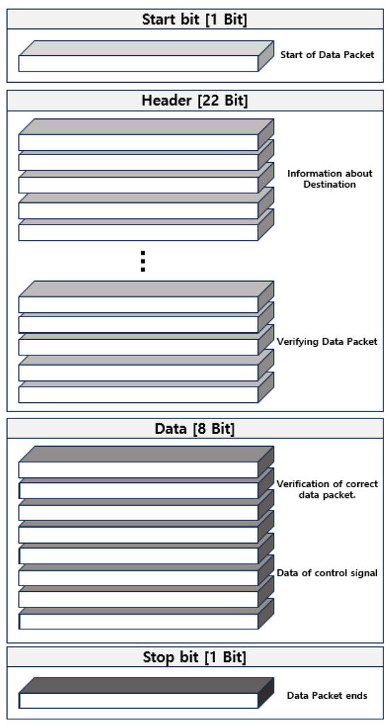 A light that passed through the FPGA generated data on the transmitter side. A unique data packet was created for data transmission, consisting of a start bit that denoted the beginning of a new packet followed by a fixed 23-bit data address. This address identified the transmitted data type and confirmed that the data packet was received correctly. The 8-bit variable data were processed immediately as the header was validated. The stop bit, which also served as the parity bit, signified the end of the data packet. The data packet structure is depicted in Figure 3.