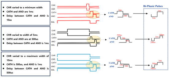 Figure 6 presents a detailed representation of the various pulse shapes and amplitudes derived from the data. CHR pulses can be modulated between 1 ms and 10 ms. CATH and ANO, which combine to form cathodic and anodic shapes of biphasic pulses, are generated in 128 different shapes and amplitudes. This feature provides our system with multiple options for controlling current leakage and crosstalk between the electrodes. Furthermore, these options enable the adjustment of stimulation current according to the different stimulation threshold values of individual patients. Another characteristic of this stimulation approach is the generation of overlapping ANO and CATH pulses. This technique effectively reduces the total stimulation time. Furthermore, creating two overlapping pulses with a 500 µs time interval further minimizes current leakage.