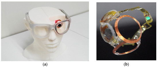 (a) Prototype of the complete system and implanted chip on top of the non-biological eye model. (b) Magnified image of the artificial retinal stimulator and receiver.