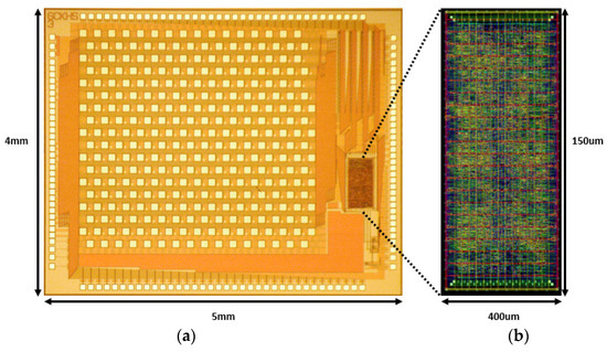 Layouts of digital controller embedded onto the chip (with an active area of 150 µm × 400 µm) and the entire chip (with the active area of 5 mm × 4 mm). (a) Complete fabrication chip picture. (b) Digital controller.