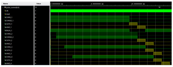 Vivado version 2020.1 was used for the simulations of the 256-pixel digital controller. The concept of overlapping current pulses was simulated, as shown in Figure 9. Overlapping pulses not only reduced the total stimulation time but also helped to reduce the current leakage that might occur while shifting from the stimulation of a phase to the next phase.