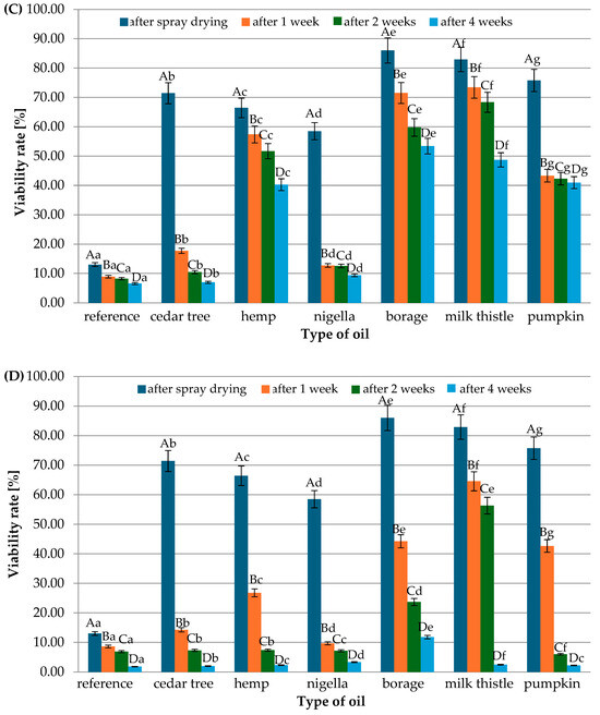 The effect of the concentration of various oils on the viability of LGG bacteria after the spray-drying and during the storage of various encapsulation systems (A) 20% of oils stored at 4 °C (B) 20% of oils stored at room temperature (C) 30% of oils stored at 4 °C (D) 30% of oils at room temperature. Values with different uppercase letters in the same column are significantly different at p < 0.05. Values with different lowercase letters in the same column are significantly different at p < 0.05. The statistical analyses were performed using Statistica version 10 StatSoft Poland, (Krakow, Poland).