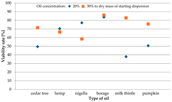 A relatively high viability rate of bacteria was also observed for systems with hemp oil (especially after adding 20% oil), which contains alpha-linoleic acid and doesn’t contain oleic acid. Pumpkin oil has almost the same content of oleic acid and linoleic acid as that of milk thistle oil. Pumpkin oil hasn’t vitamin E (while milk thistle has 48 mg/100 g), however, presents a stronger protective effect in the case of 20% oil (51.64% vs. 37.91%). Pumpkin oil (without vitamin E and without γ-linolenic acid content) demonstrated a stronger protective effect compared to cedar tree oil, which has vitamin E and γ-linolenic acid in its composition (Table 2).