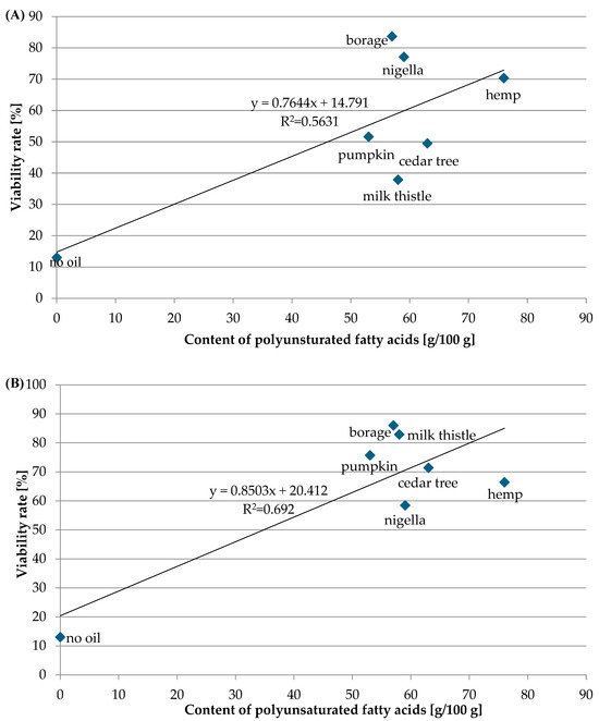 Viability rate as a function of polyunsaturated fatty acids content in oils used (A) systems of 20% of oil in the dry mass of starting dispersion (B) systems of 30% of oil in the dry mass of starting dispersion.