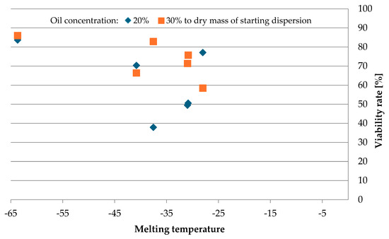 Additionally, it can be noticed that the values of the R-squared (R2) coefficient of determination and the slope of line a for the equation y = ax + b are higher with a higher share of unsaturated acids in the tested oils (30% by weight compared to 20%), which could confirm the beneficial effect of the content of unsaturated fatty acids on the increase in viability during the drying process.