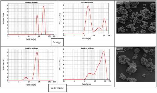 The particle size distribution of powders was measured using the particle size analyzer MasterSizer 2000 (Malvern Instruments, Malvern, UK) with a Scirocco 2000 dry sampling system (Malvern Instrument Ltd., Worcestershire, UK). All parameters were kept constant: refractive index: 1.52, vibration feed rate: 40–50%, measurement time: 15 s, 5 scans, dispersive air pressure: 4 bar. The size of particles was described as volume-weighted mean D4,3. The final values are the average of 3 measurements.