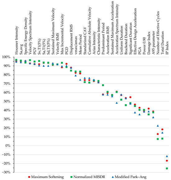 The validity verification of the proposed methodology is carried out by comparing Model Set 2 with models that utilize Compound IMs (CIMs) generated using Canonical Correlation Analysis (CCA) [19]. An analytical discussion on the method of CCA-generated CIMs can be found in the cited literature [19]. The CIM for the 10 selected IMs is calculated through CCA for each DI (Normalized MISDR, Maximum Softening, and Modified Park–Ang). Since the CIM is related to only one DI at a time, to enable direct comparison with the proposed methodology, it is evident that the compound Engineering Demand Parameter (EDP) coincides with the DI of choice, i.e., the Normalized MISDR, the Maximum Softening, and the Modified Park–Ang DIs. After the Canonical Correlation Analysis in the logarithmic scale, the CIM and the DI are reverted to the original scale. A conventional regression analysis is carried out to obtain a relationship between the CIM and the DI in the same form as the proposed methodology, i.e., “DI = a ∙ CIM” (hereby referenced as the CCA Model). The calculated prediction equations for the Normalized MISDR, Maximum Softening, and Modified Park–Ang DIs are shown in Equations (9)–(11).