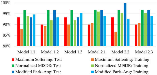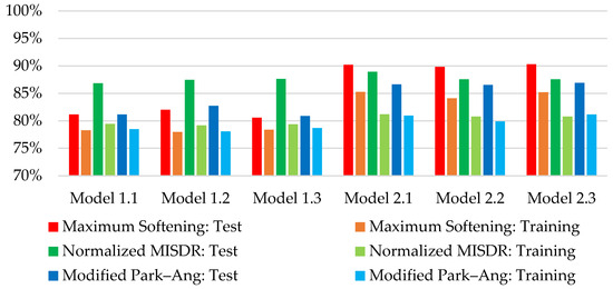 Figure 5 presents the standard deviation of prediction accuracy that Model Set 1 and Model Set 2 exhibit separately for the test and training subsets. In both the testing and training subsets, the proposed models of Model Set 2 present, on average, an overall improvement over their Model Set 1 counterparts regarding the prediction accuracy of the observed damage grade (reference solution), as well as in correctly identifying the observed damage grade (minor, moderate, or severe). Table 10 presents the average prediction accuracy and average success in determining the correct damage grade of the three predicted DIs for each generated predictive model. Model Set 2 provides, on average, more accurate estimates of the observed damage grade (numerical value of the DI), with an improvement ranging from 3.91% to 5.55% for the test set and from 3.19% to 3.73% for the training set. Regarding the success in the correctly identified damage grades, both Model Sets present similar average success rates, with an improvement of up to 2.23% for the test set and up to 1.34% for the training set.